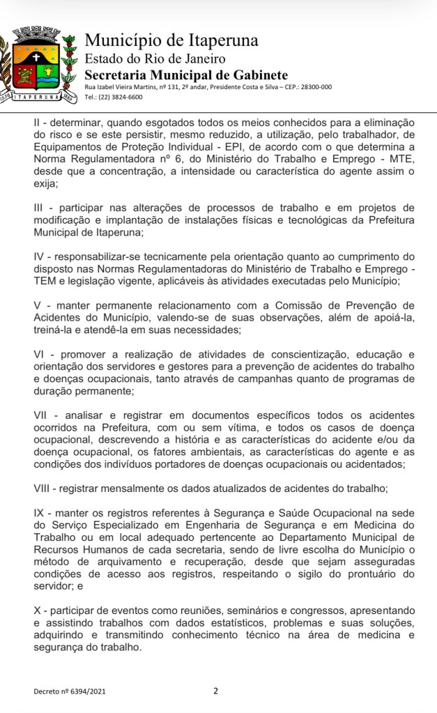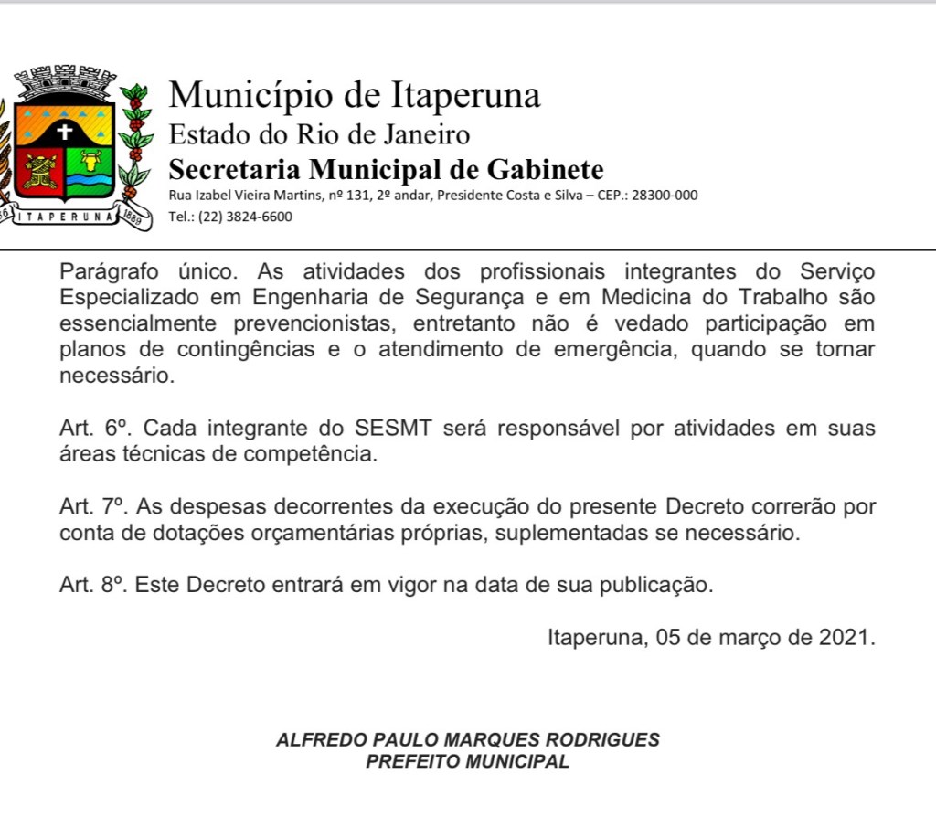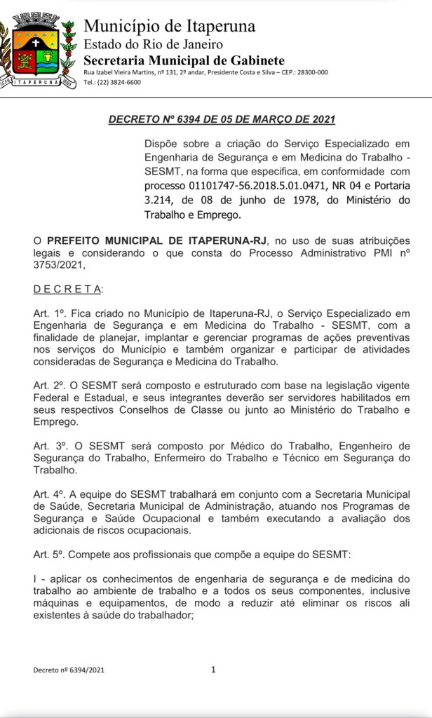 O SESMT foi instituído pela Prefeitura Municipal de Itaperuna-RJ, pelo decreto nº 6394 de 05/03/2021, ligado à Secretaria Municipal de Administração, tendo o competente Advogado Dr João Paulo Medeiros da Silva, à frente da pasta, e a Secretaria Municipal de Saúde, com outro competente Advogado Dr Marcelo Poeys, com a preocupação do Executivo com a proteção a integridade física e o bem-estar de seus servidores.