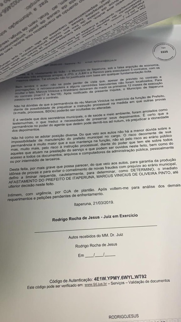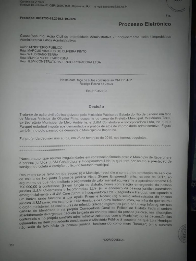 O pedido de afastamento do prefeito foi feito no âmbito Ação Civil Pública nº 0001755-15.2019.8.19.0026, que já resultou na indisponibilidade dos bens do prefeito, ex-secretário municipal de Meio Ambiente, Waldriano Terra e o empresário Luiz Henrique Barbalho de Souza, sócio majoritário da JL&M.