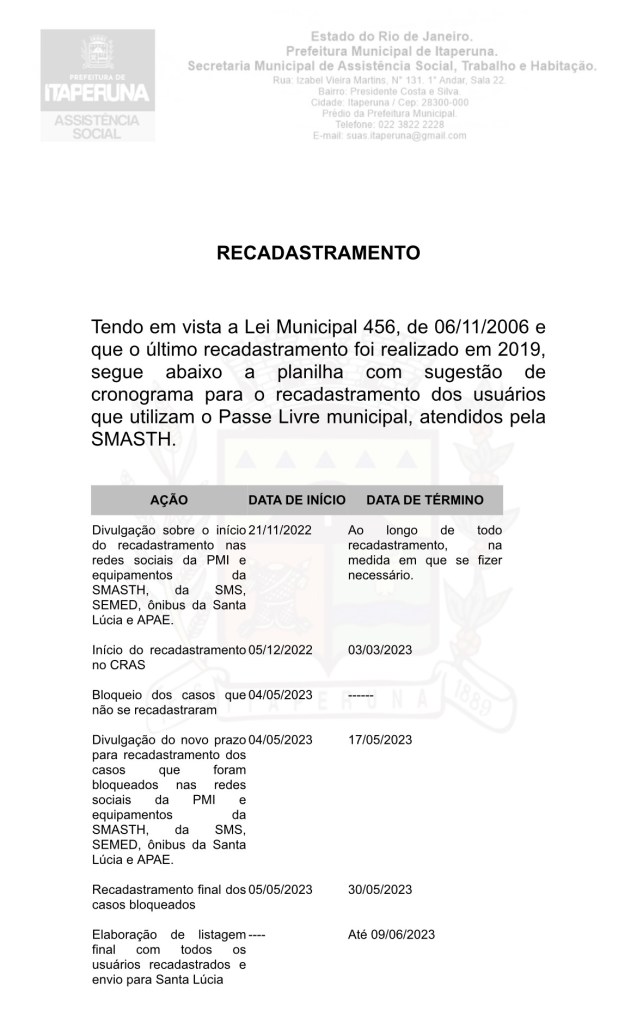 A Prefeitura de Itaperuna esclarece que, de acordo com a legislação municipal, foi convocado, com aviso nas unidades dos CRAS’s e nos ônibus, um novo recadastramento para atualização de dados para o benefício do Passe Livre.Continua após publicidade.
