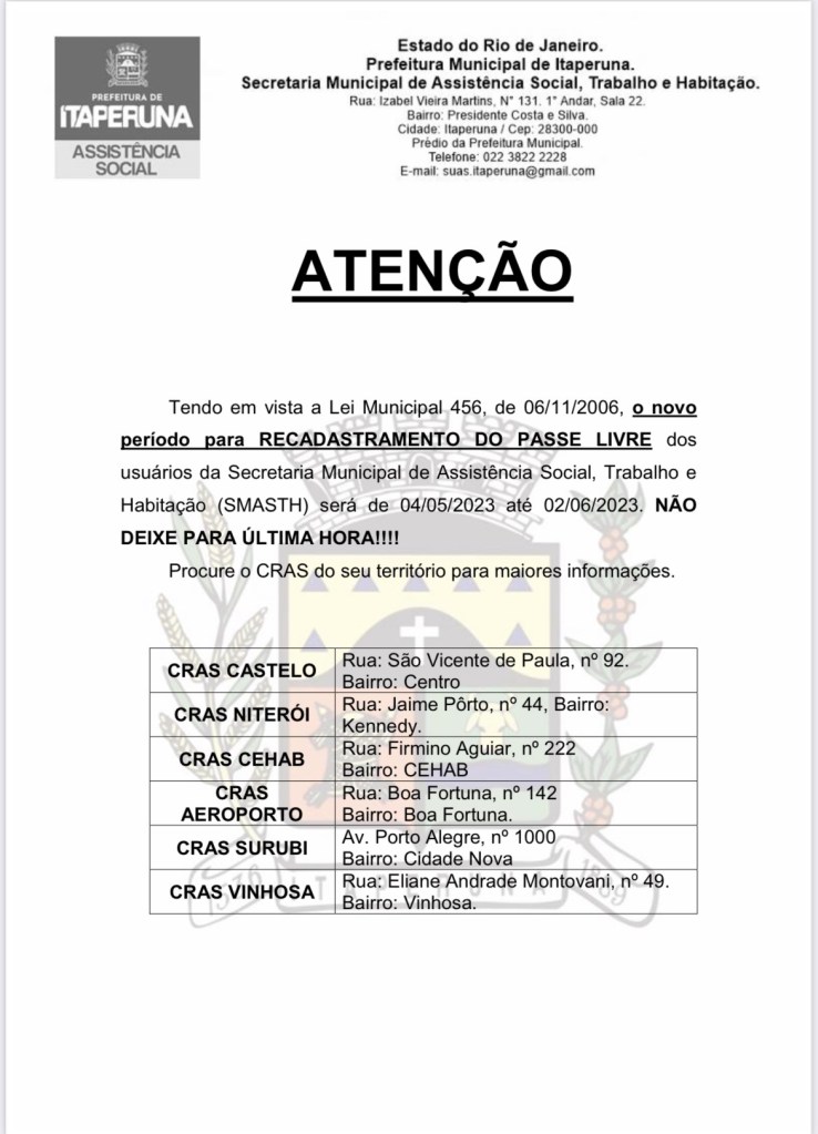 Tendo em vista a Lei Municipal 456, de 06/11/2006, o novo período para RECADASTRAMENTO DO PASSE LIVRE dos usuários da Secretaria Municipal de Assistência SocialTrabalho e Habitação (SMASTH) será de 04/05/2023 até 02/06/2023. NÃO DEIXE PARA ÚLTIMA HORA!!!!