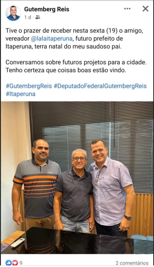 “Tive o prazer de receber nesta sexta (19) o amigo, vereador @lalaitaperuna, futuro prefeito de Itaperuna, terra natal do meu saudoso pai.”