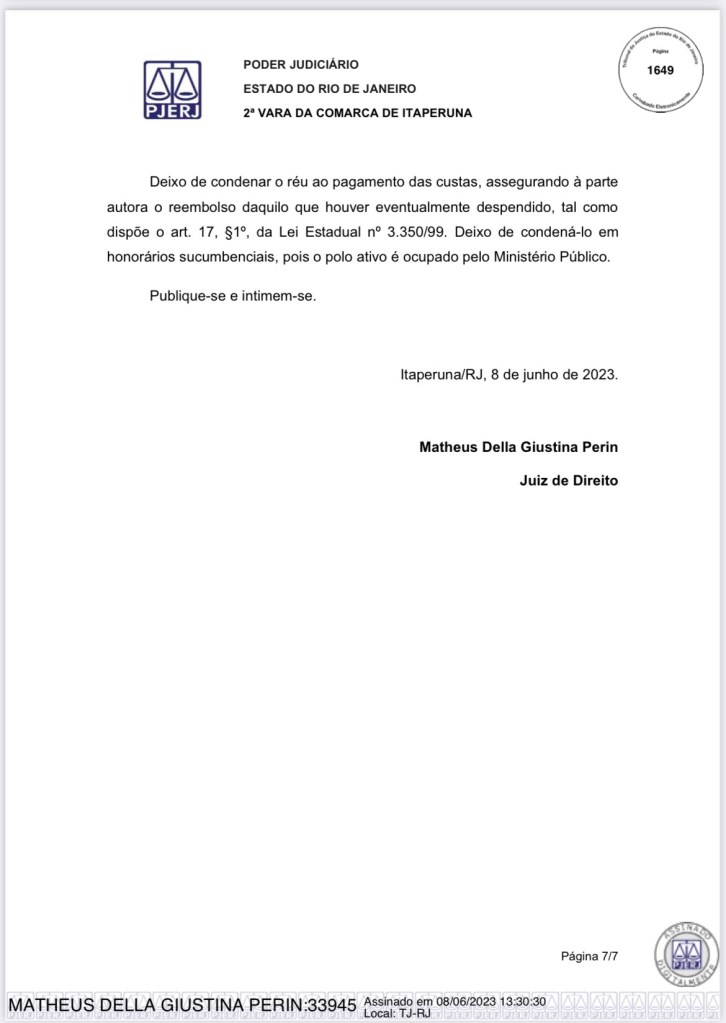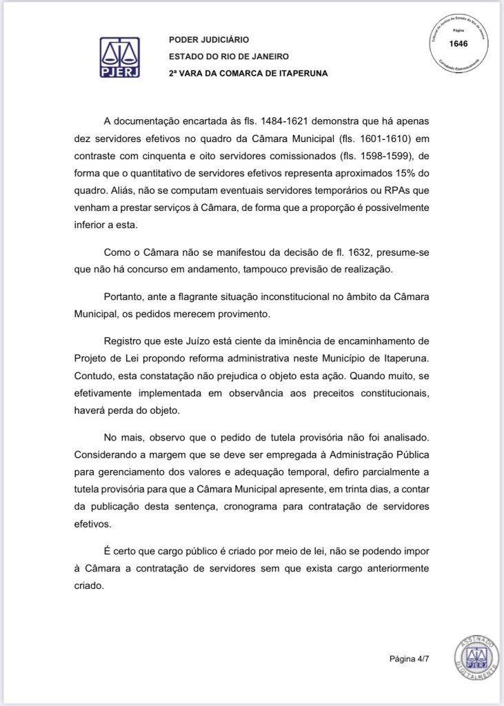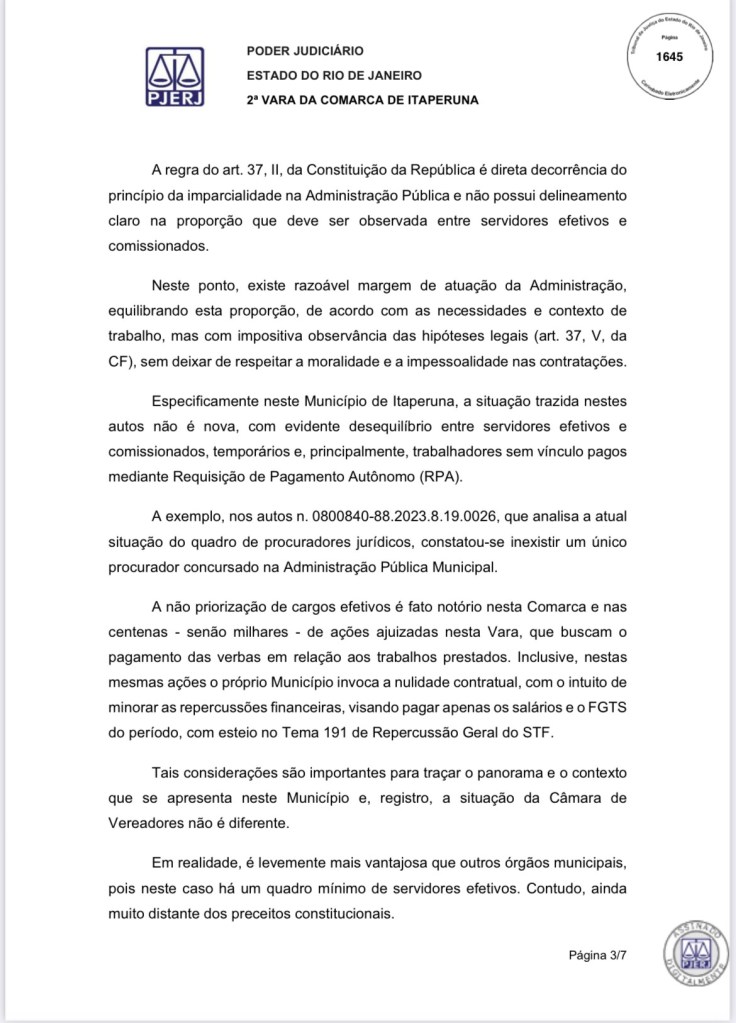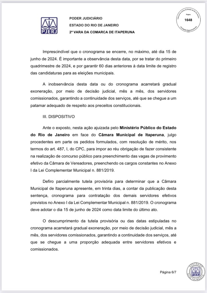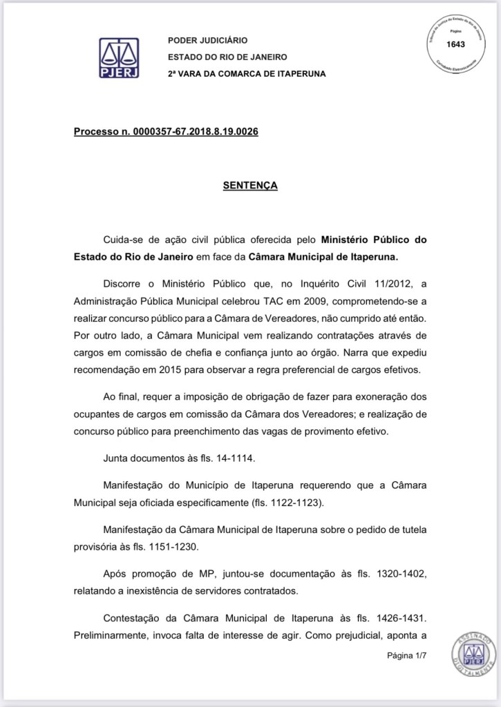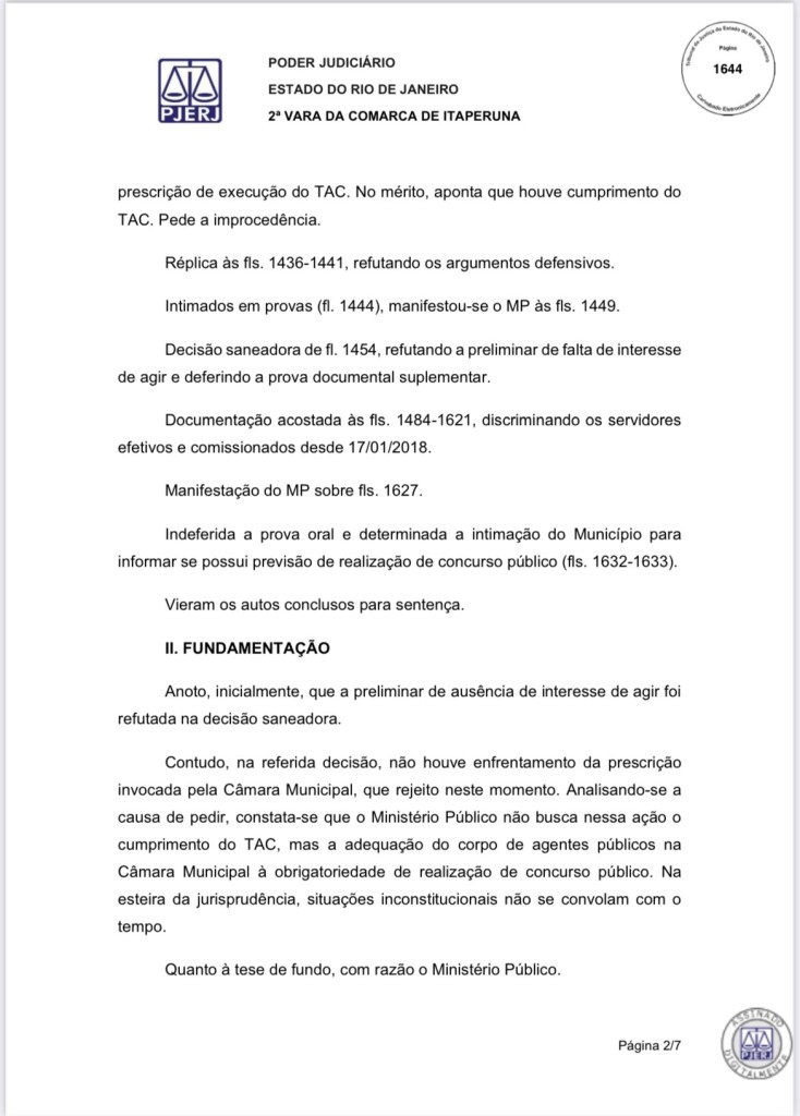 O Juízo da 2ª Vara da comarca de Itaperuna-RJ determinou através de sentença judicial que a câmara municipal de Itaperuna-RJ, realize concurso público para preenchimento de vagas de provimento efetivo.(veja sentença).