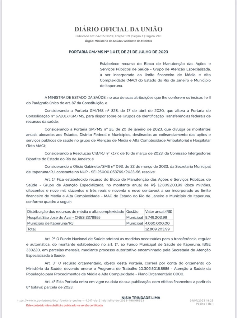 Nesta segunda-feira, 24, foi publicado no Diário Oficial da União, na edição 139, seção 1, página 240, a Portaria GM/MS Nº 1.017 de 21 de julho de 2023, que estabelece recurso do Bloco de Manutenção das Ações e Serviços Públicos de Saúde – Grupo de Atenção Especializada.