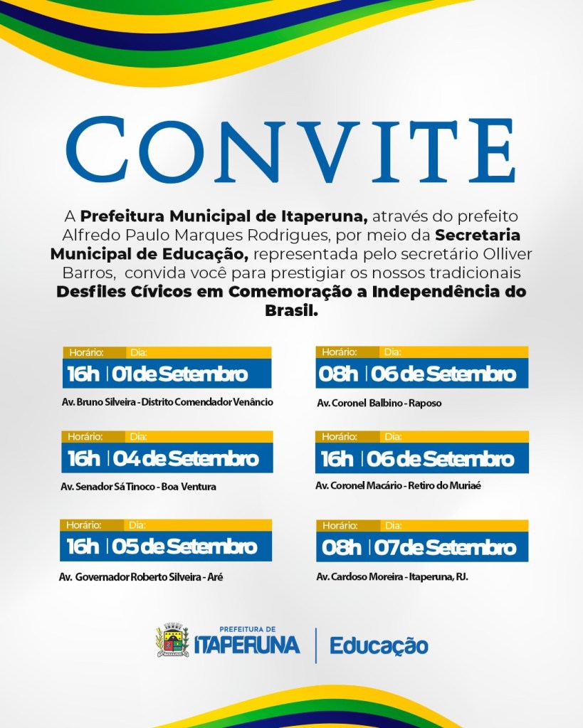 A Prefeitura Municipal de Itaperuna e Secretaria de Educação-SEMED, convida a todos para os Desfiles Cívicos em Comemoração a Independência do Brasil.(veja datas e horários)