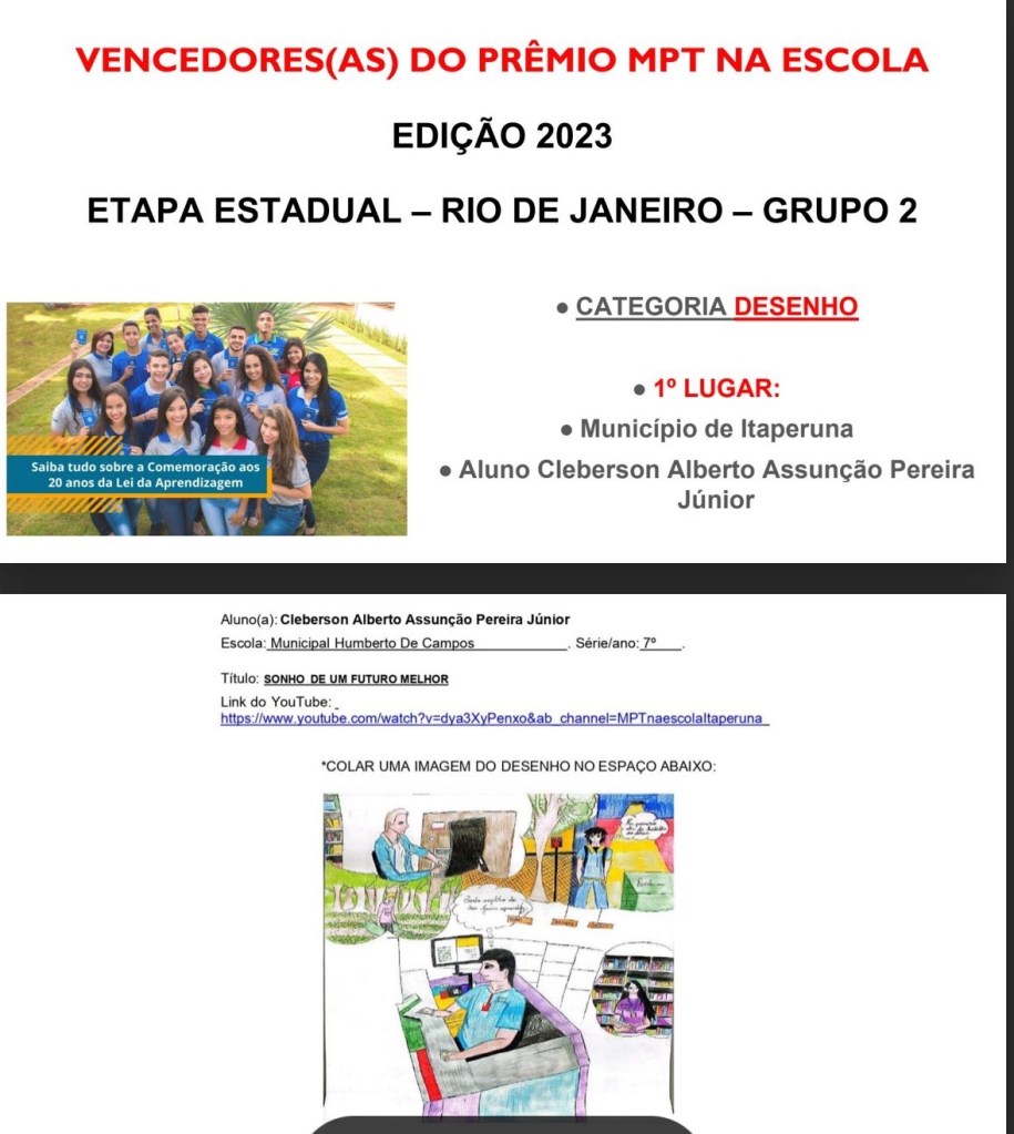O Município de Itaperuna-RJ e a SEMED, não medem esforços em participar de eventos desta natureza e sempre se destacando nas modalidades existentes. No Prêmio MTP na Escola 2023, não foi diferente o aluno Cleberson Alberto Assunção Pereira Júnior do 7º ano da E.M. Humberto de Campos, na Etapa Estadual Grupo 2, foi o vencedor do prêmio Categoria Desenho, com o título Sonho de um futuro melhor.