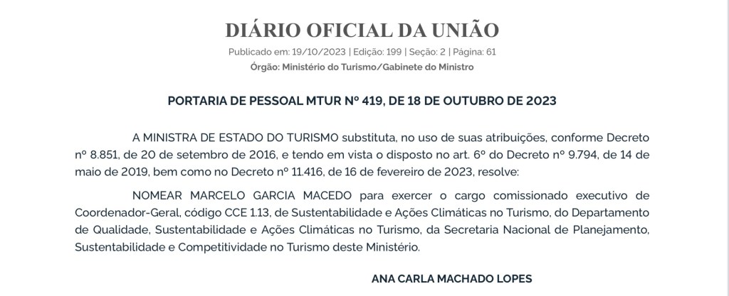 O deputado federal Murillo Gouvêa-União Brasil, confirma o prestígio crescente e a liderança emergente. Pensando no fortalecimento do Turismo do Estado do Rio, especialmente para Itaperuna e o Noroeste onde fica a única estância hidromineral do Rio, Raposo, indicou o ex-vereador de São Francisco do Itabapoana-RJ e ex-secretário de Governo de Itaperuna, Marcelo Garcia para atuar no Ministério do Turismo, em Brasília. No último dia 18/10 foi publicada a portaria de nomeação de Marcelo Garcia Macedo para o cargo de Coordenador-Geral, de Sustentabilidade e Ações Climáticas no Turismo, do Departamento de Qualidade, Sustentabilidade e Ações Climáticas no Turismo, da Secretaria Nacional de Planejamento, Sustentabilidade e Competitividade no Turismo deste Ministério.