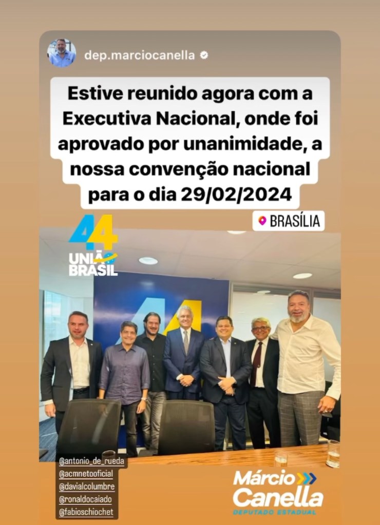 Hoje 20/11/2023, em Reunião da Executiva Nacional do UNIÃO BRASIL, foi aprovada por unanimidade, a data da Convenção Nacional Ordinária do Partido para o dia 29 de fevereiro de 2024, mantendo-se inalterados os atuais mandatos.