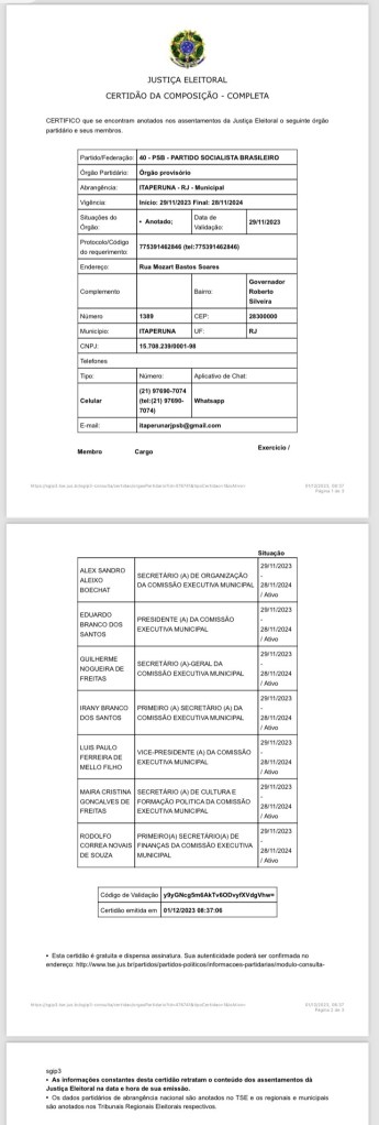 Na última quarta-feira 29/11/2023, o secretário de Esporte e Lazer de Itaperuna-RJ, Eduardo do Toldo, assumiu a presidência da Comissão Executiva Municipal do Partido Socialista Brasileiro, com vigência até 28/11/2024(veja certidão), situação ampliando o número de partidos em sua base, visando as eleições municipais de 2024.