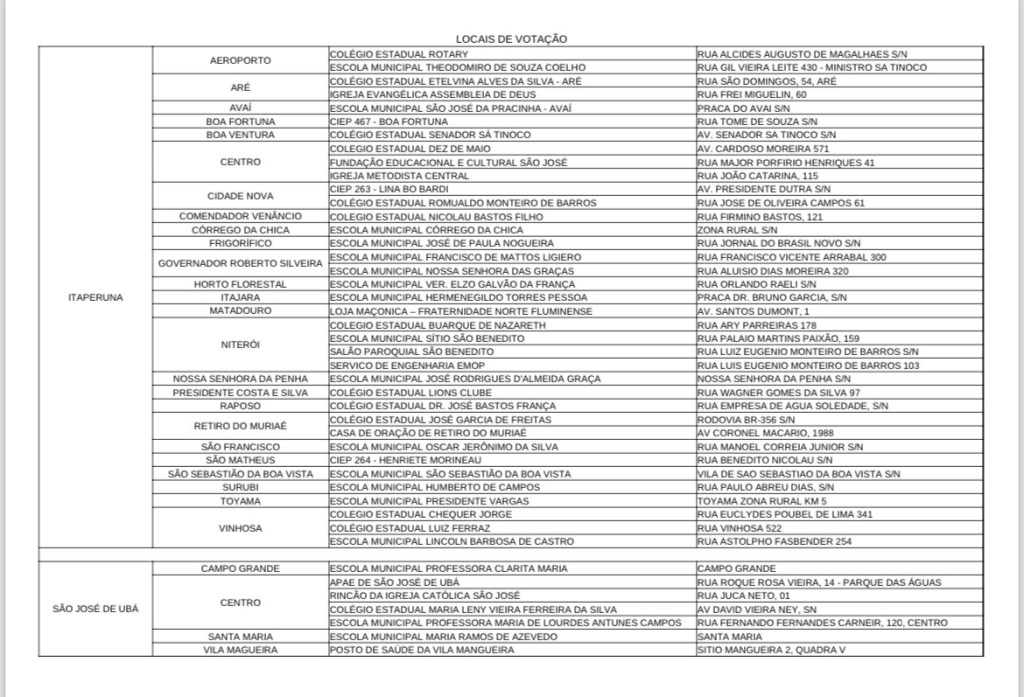 avisa aos eleitores de Itaperuna e São José de Ubá que, para as Eleições de 2024, ocorrerá algumas mudanças nos locais de votação: