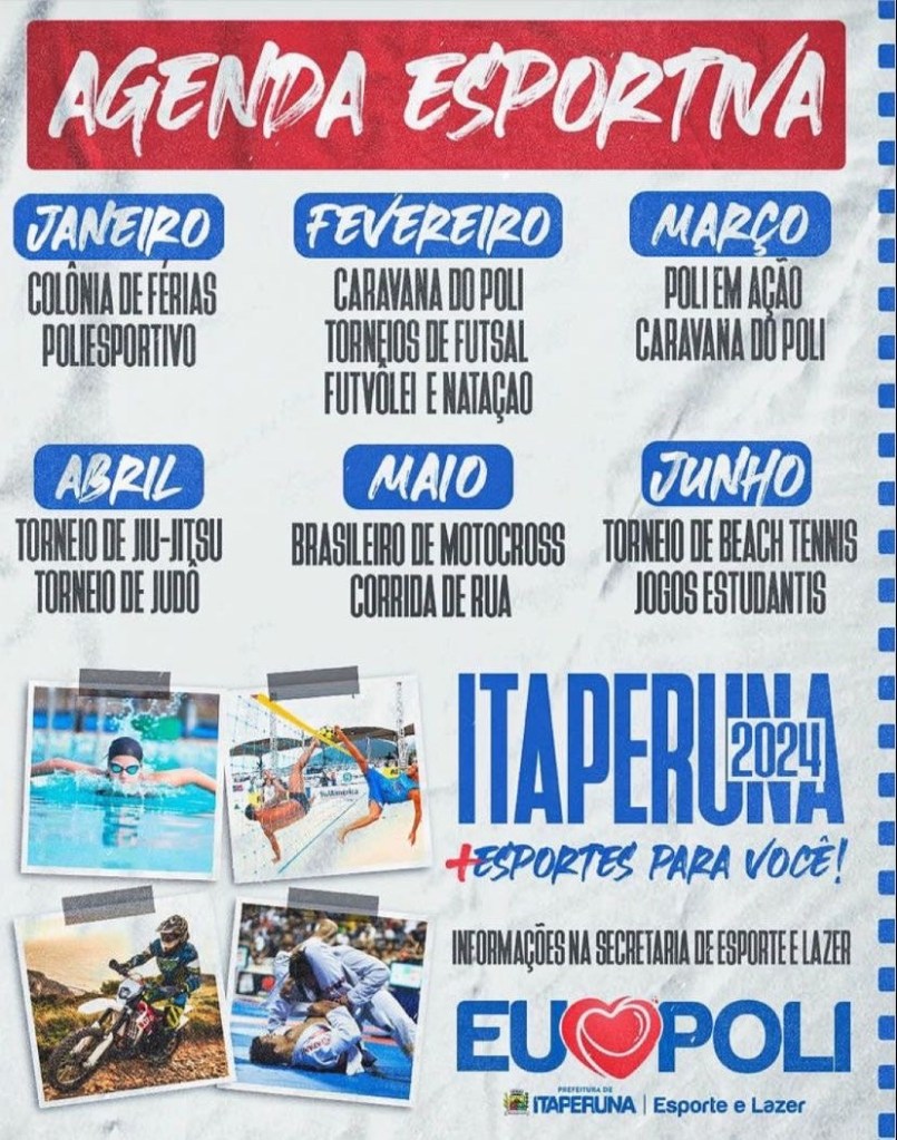 Desde a sua chegada a frente da secretaria municipal de Esporte e Lazer de Itaperuna-RJ, que Eduardo do Toldo vem incrementando a agenda esportiva no município. Em 2024 não seria diferente, a secretaria acaba de divulgar sua agenda esportiva para os meses de Janeiro a junho de 2024.(veja informativo).