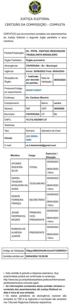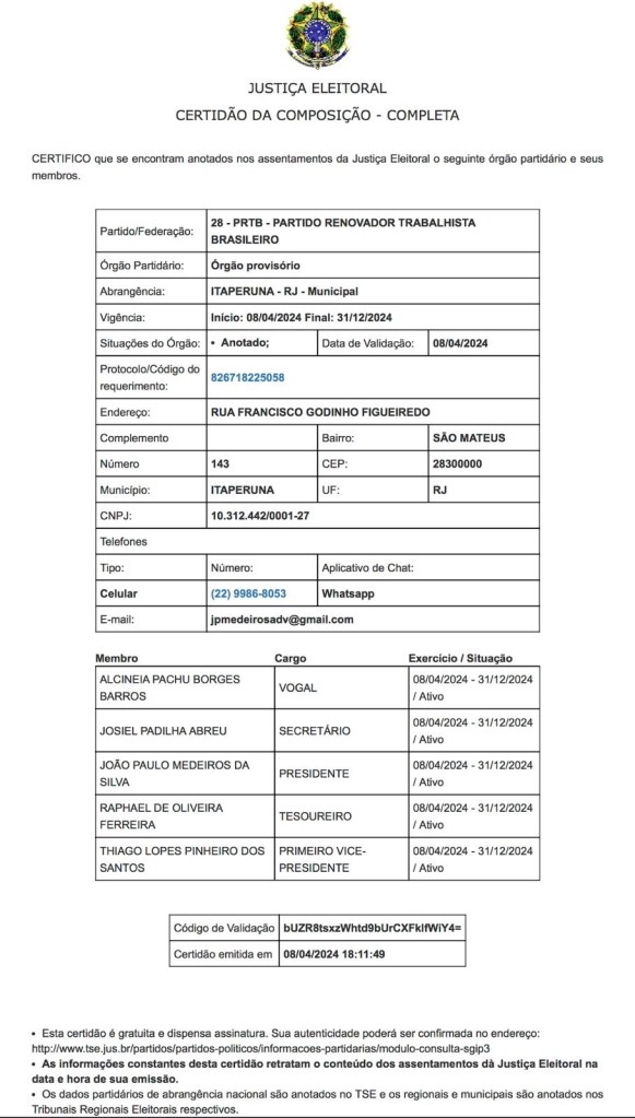 Nesta segunda-feira 08/04/2024, o advogado João Paulo Medeiros da Silva, irmão do pré-candidato Emanuel Medeiros da Silva “NEL”, assumiu a presidência do PRTB, partido que compunha a base do pré-candidato Kadu Novaes, dando um nó estratégico e tático, no candidato da oposição.(certidão anexo).