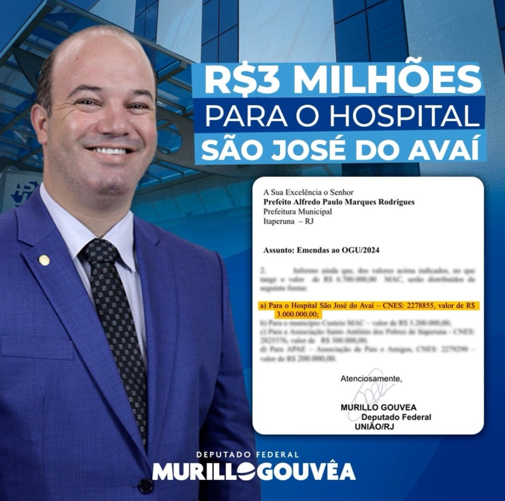 O Deputado Federal Murillo Gouvêa-UNIÃO-RJ, único representante eleito nas regiões Norte e Noroeste do Estado do Rio, em sua busca pelas melhorias do interior, principalmente para a saúde, apresenta mais uma conquista para a população: a indicação de uma emenda parlamentar individual no valor de R$ 3.000.000,00 (três milhões de reais) para o HOSPITAL SÃO JOSÉ DE AVAÍ, CNES: 2278855, para Incremento-MAC.