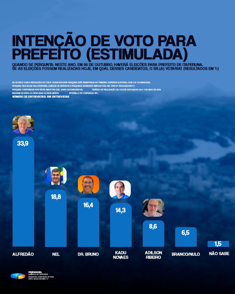 O atual prefeito de Itaperuna e pré-candidato à reeleição, Alfredo Paulo Marques Rodrigues “Alfredão”(União), lidera na primeira pesquisa de intenção de votos registrada no município. Na estimulada, quando se apresentam ao entrevistado os nomes dos possíveis pré-candidatos a prefeito, Alfredão aparece com 33,9%, seguido de Emmanuel Medeiros, Nel (PL) 18,8%. Na terceira posição aparece Doutor Bruno(Novo) com 16,4%. Na quarta posição aparece Kadu Novaes (Republicanos) com 14,3%, Adilson Ribeiro com 8,6%. Brancos e nulos somam 6,5%, e 1,5% respondeu não saber em quem votar.