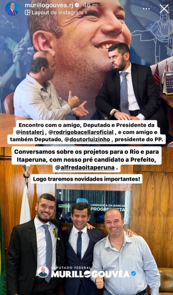 2024 é ano de eleições municipais, as oportunidades de se estreitarem essas relações é fato, e o deputado estadual Rodrigo Bacellar, presidente do União-RJ, e Presidente da Alerj, com seu poder de articulação e de conciliar, imediatamente buscou o diálogo com a família Bolsonaro, e na oportunidade esteve com o deputado federal Murillo Gouvêa-UNIÃO-RJ, único deputado federal eleito nas regiões Norte e Noroeste do estado Rio, estreitando os laços para as composições municipais e tratar de projetos para o estado do Rio e em especial para o município de Itaperuna-RJ!