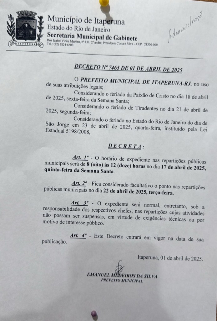 O prefeito municipal Emanuel Medeiros da Silva “Nel”do PL, decreta: que o expediente do dia 17/04/2025 quinta-feira, será das 08h às 12h e no dia 22/04/2024, terça-feira será ponto facultativo.(veja decreto).